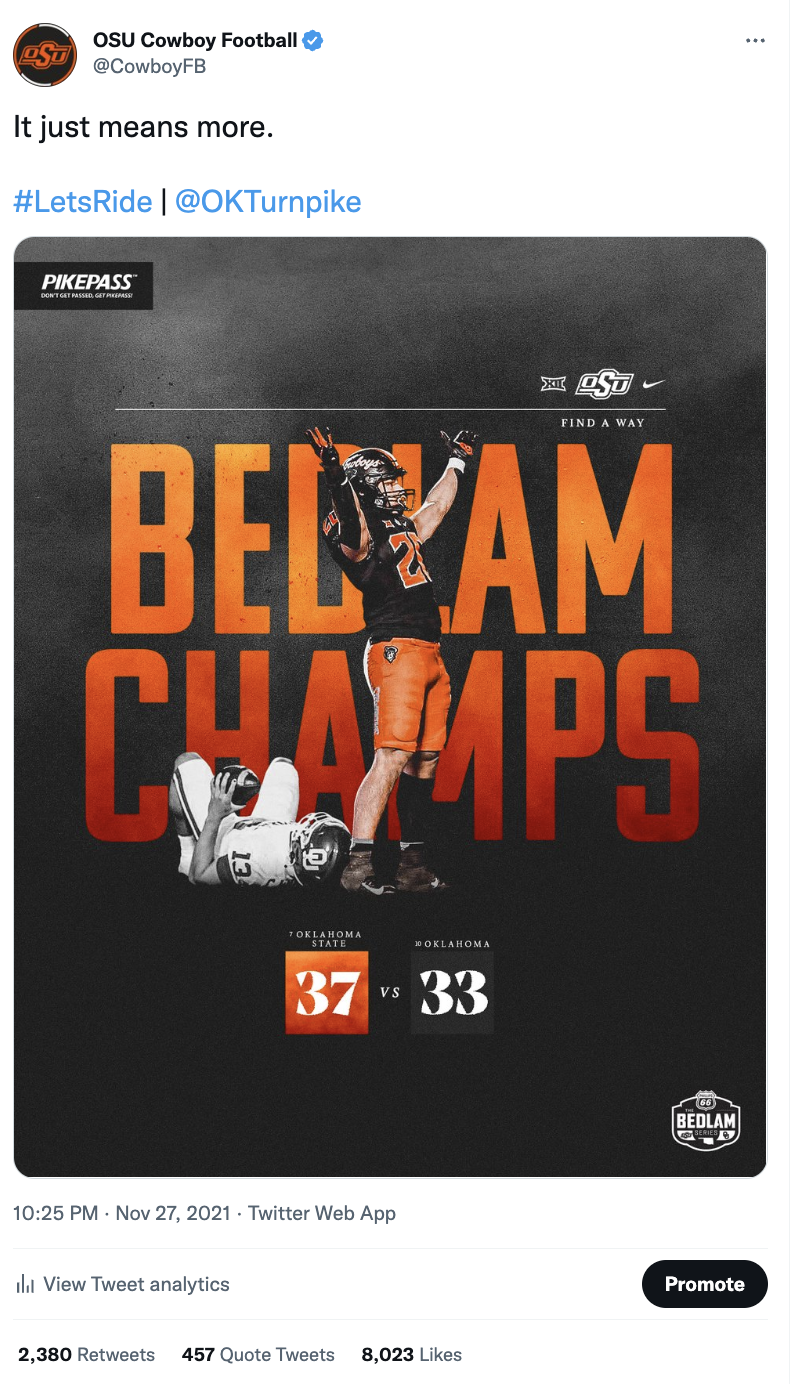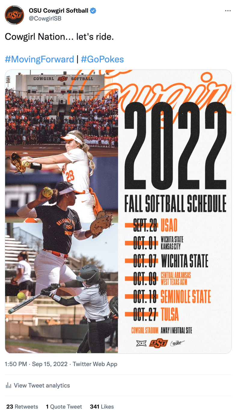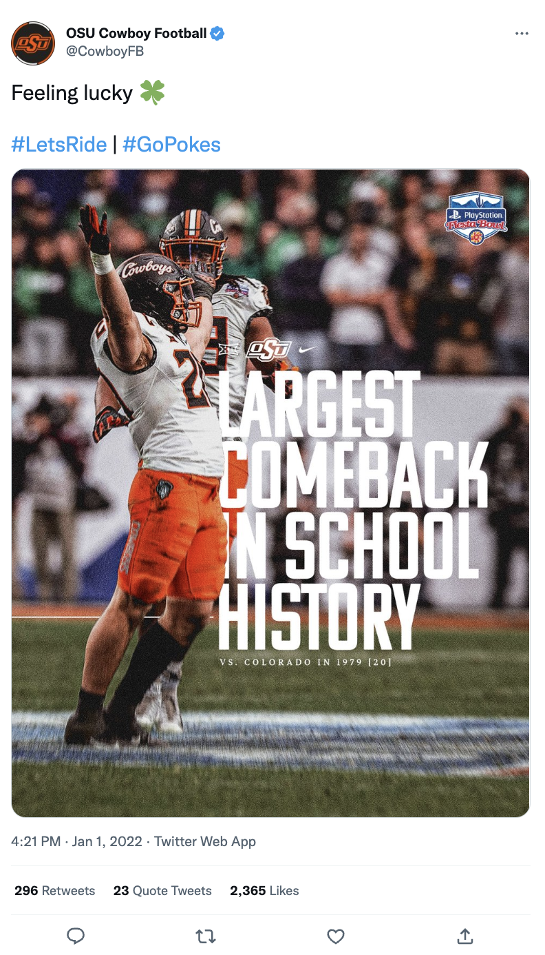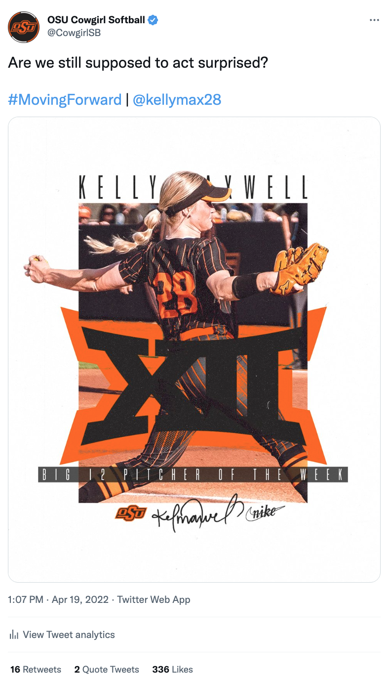 Showcased below is a collection of posts I’ve had the privilege of creating in my roles with the Big 12 Conference, the College Football Playoff and Oklahoma State softball, football and men's basketball. Linked above is my Gondola profile, with a more in-depth look at the social media content and engagement metrics I’m responsible for.